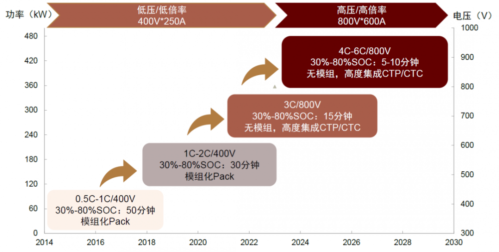 緩解補(bǔ)能焦慮,電動(dòng)汽車快充步入4C+時(shí)代。補(bǔ)能焦慮是制約新能源車滲透率持續(xù)提升的關(guān)鍵因素之一,而快充技術(shù)是緩解補(bǔ)能焦慮的有效途徑。根據(jù)《中國(guó)高壓快充產(chǎn)業(yè)發(fā)展報(bào)告(2023-2025)》,在電動(dòng)汽車推廣初期,消費(fèi)者對(duì)充電速度關(guān)注不多,電動(dòng)汽車補(bǔ)能方式以慢充為主,充電倍率在0.5C以下;隨著電動(dòng)汽車的加速滲透、電池容量的不斷增加,原有補(bǔ)能效率已不能滿足用戶需求,驅(qū)動(dòng)電動(dòng)汽車充電技術(shù)得到突破,充電倍率從1C迅速演進(jìn)到2C。根據(jù)《中國(guó)高壓快充產(chǎn)業(yè)發(fā)展報(bào)告(2023-2025)》,由于高倍率快充技術(shù)尚不成熟、供應(yīng)鏈不完善,當(dāng)前電動(dòng)汽車的主流充電倍率在1C-2C左右,普遍采用400V電壓平臺(tái),充電功率達(dá)到100kW左右,30%-80%SOC平均充電時(shí)長(zhǎng)在30min及以上,與燃油車不到10min的補(bǔ)能時(shí)間相比差距較大。隨著高倍率電芯材料的突破、800V高壓零部件產(chǎn)業(yè)鏈的完善以及電池?zé)o模組結(jié)構(gòu)帶來(lái)冷卻效率的提升,快充技術(shù)進(jìn)一步從2C迭代到4C乃至更高倍率水平,補(bǔ)能效率得到進(jìn)一步提升,30%-80%SOC充電時(shí)長(zhǎng)有望壓縮在10min以內(nèi)。2021年9月,搭載巨灣3C倍率電池的廣汽AION V Plus車型量產(chǎn)。2022年6月,寧德時(shí)代發(fā)布新款4C倍率麒麟電池,并于1Q23實(shí)現(xiàn)量產(chǎn),電動(dòng)汽車有望步入4C+超級(jí)快充時(shí)代。