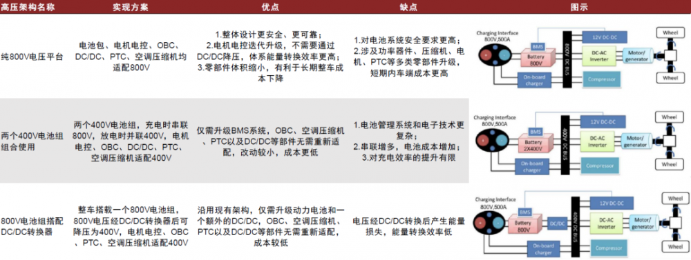 圖表3:實(shí)現(xiàn)高壓快充的三類系統(tǒng)架構(gòu)對(duì)比