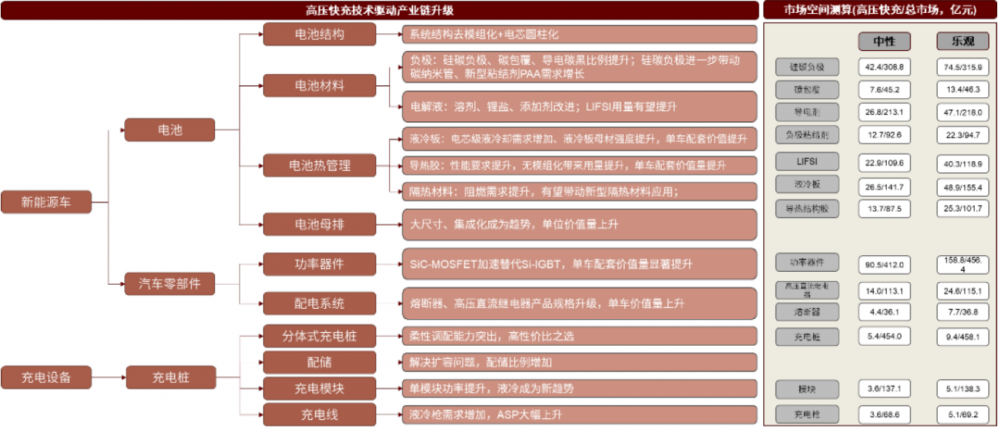 圖表5:高壓快充技術(shù)驅(qū)動(dòng)產(chǎn)業(yè)鏈升級(jí),我們預(yù)計(jì)細(xì)分市場(chǎng)空間有望擴(kuò)容